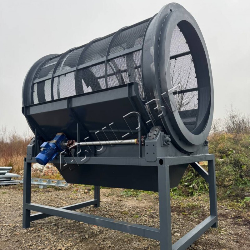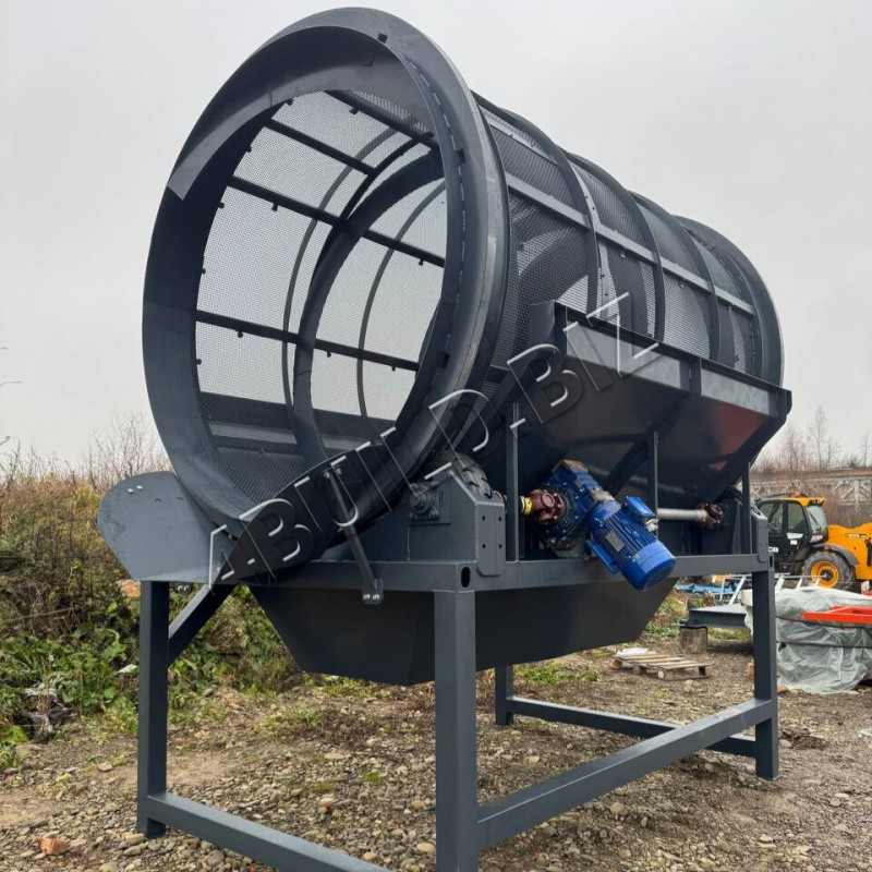 Конструкция оснащена барабаном диаметром 2000 мм и длиной 3000 мм, выполненным из специальной канилированной сетки с ячейкой 8 мм, что гарантирует точное и качественное просеивание.
