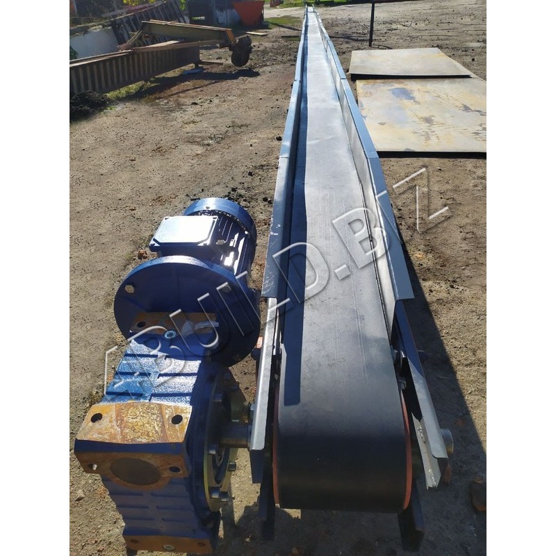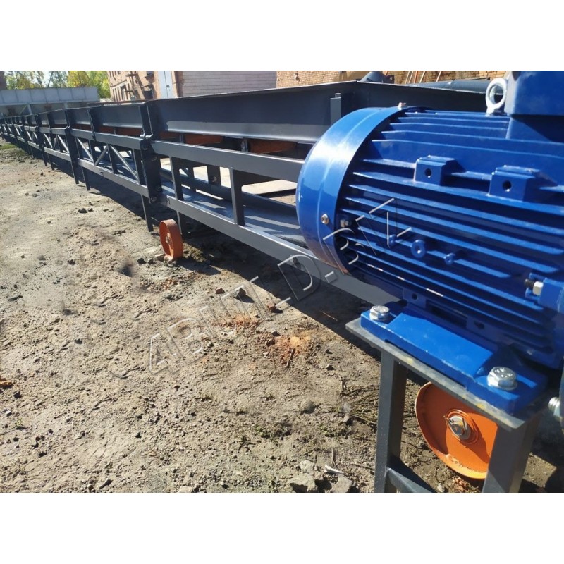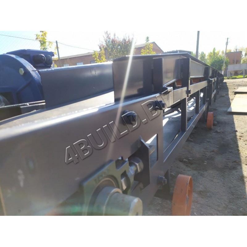 Транспортер стрічковий являє собою зварену ферму з металу (за бажанням можна з нержавіючої сталі), на верхньому кінці ферми розташований провідний барабан, що приводиться рухом електродвигуном через черв'ячний одноступінчастий редуктор. На нижньому кінці ферми розташований натяжний барабан.