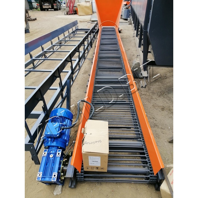 Транспортер являє собою зварену ферму з металу (за бажанням можна з нержавіючої сталі), на верхньому кінці ферми розташований провідний барабан, що приводиться рухом електродвигуном через черв'ячний одноступінчатий редуктор. На нижньому кінці ферми розташований натяжний барабан. В якості переміщуваного механізму використовуються ланцюги