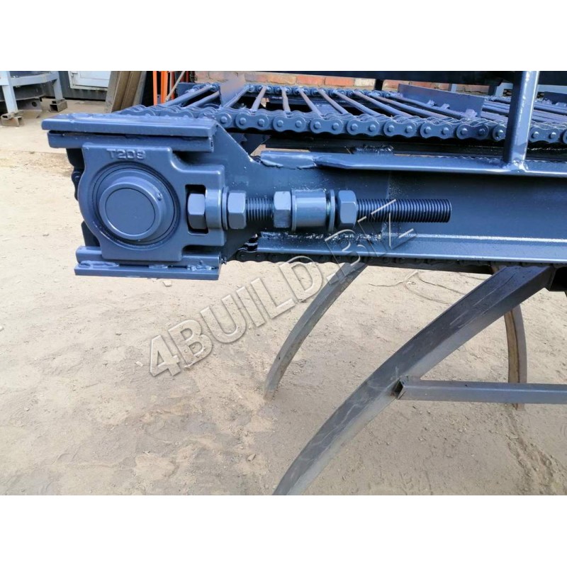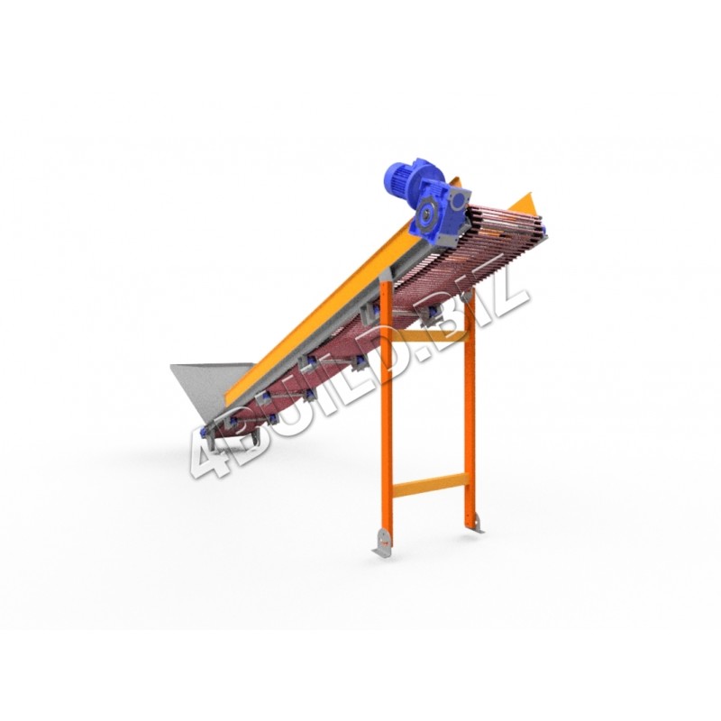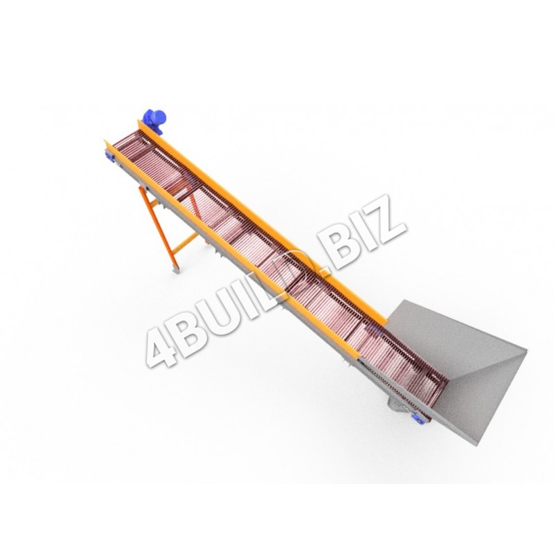 Транспортер являє собою зварену ферму з металу (за бажанням можна з нержавіючої сталі), на верхньому кінці ферми розташований провідний барабан, що приводиться рухом електродвигуном через черв'ячний одноступінчатий редуктор. На нижньому кінці ферми розташований натяжний барабан. В якості переміщуваного механізму використовуються ланцюги