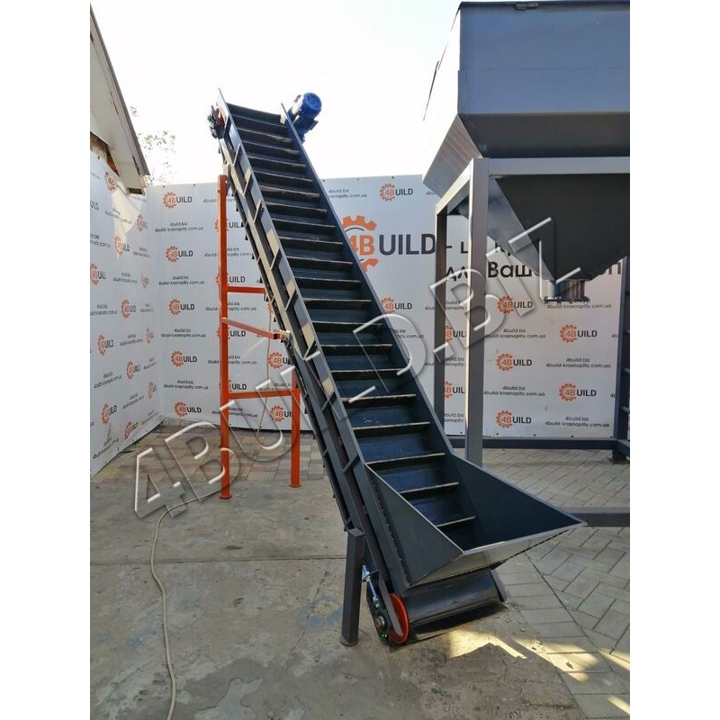 Стійки виготовляються з металу та різної висоти, в залежності від застосування конвеєра та вимог Замовника. Кут нахилу вибирається при замовленні. При включенні електродвигуна, провідний барабан приводить в рух нескінченну конвеєрну стрічку, на яку подається і переміщається по ній вгору необхідний компонент.