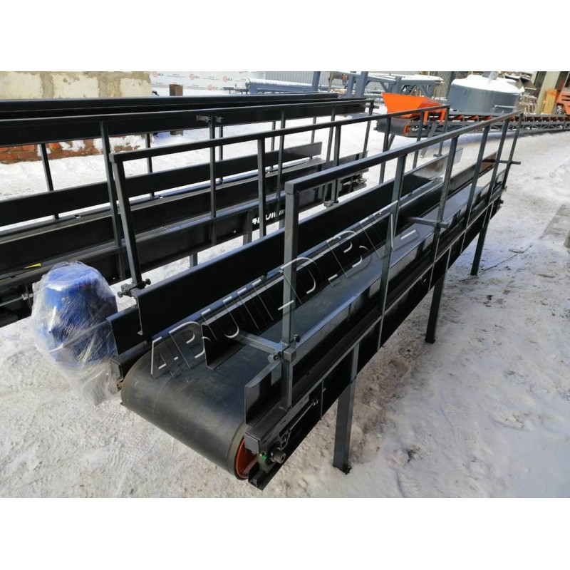 Стійки виготовляються з металу та різної висоти, в залежності від застосування конвеєра та вимог Замовника. Кут нахилу вибирається при замовленні. При включенні електродвигуна, провідний барабан приводить в рух нескінченну конвеєрну стрічку, на яку подається і переміщається по ній вгору необхідний компонент.