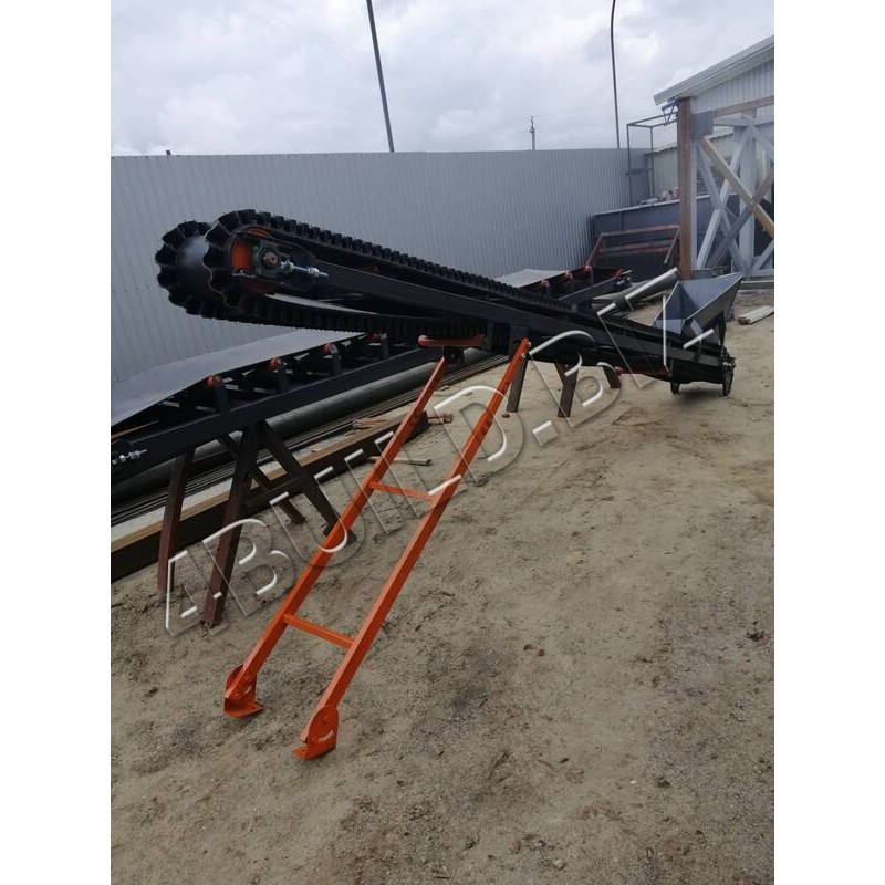 Барабани огинає нескінченна вулканізована конвеєрна стрічка з шевронними бортами, що спирається на верхні опорні ролики і плоскі нижні роликові опори. У робочому положенні ферма спирається на стійку.