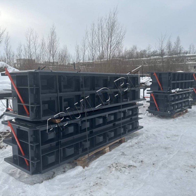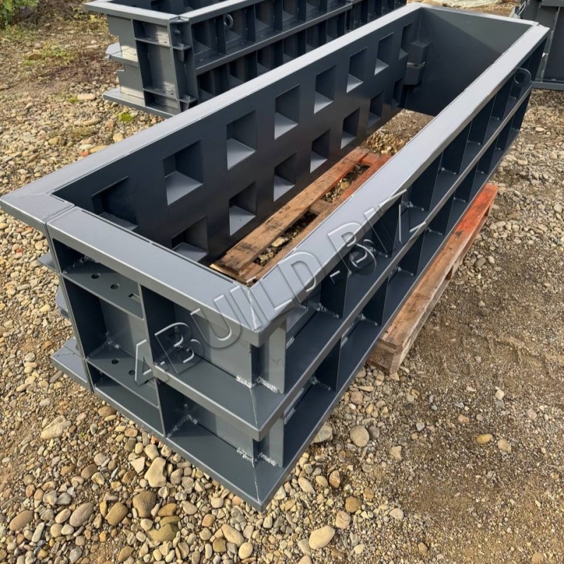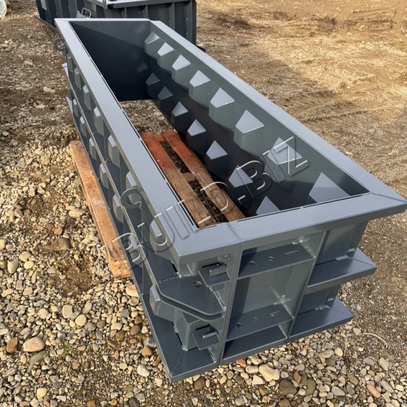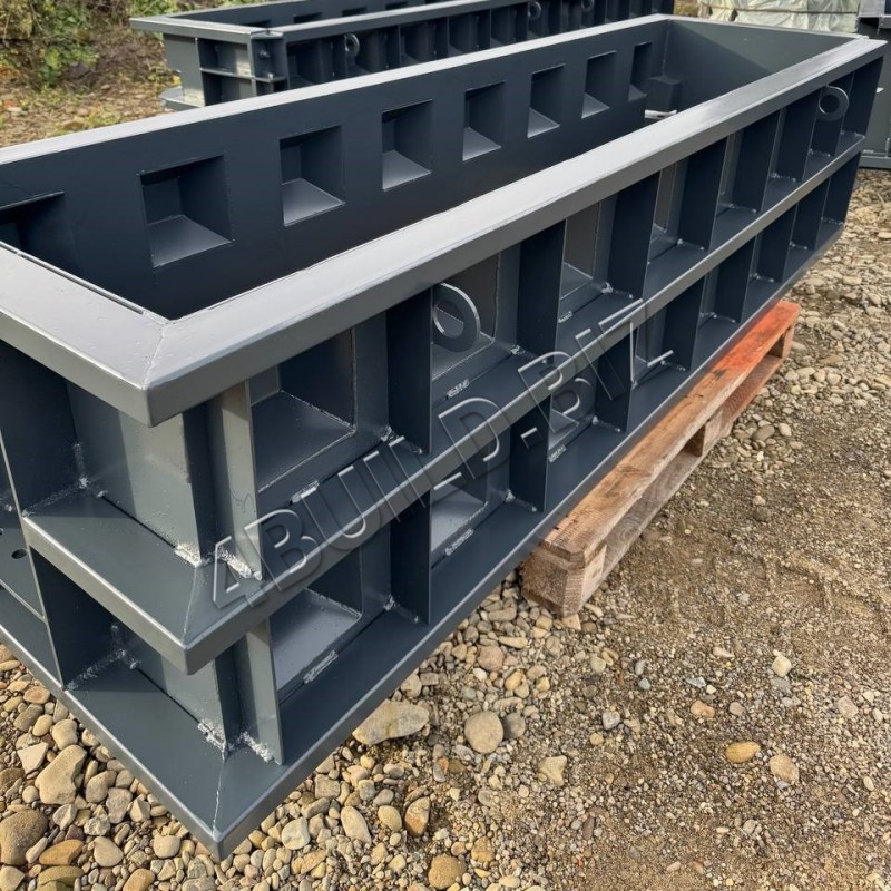 Форма виготовлена з листової сталі товщиною 4 мм, що забезпечує ідеальну геометрію та високу стійкість до зносу. Конструкція металоформи оснащена провушинами для болтового з’єднання, які забезпечують надійну фіксацію елементів під час формування та спрощують процес розпалубки.