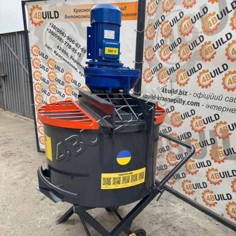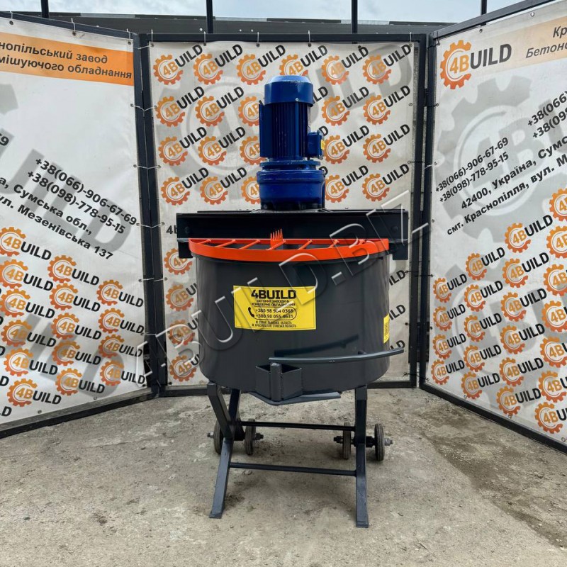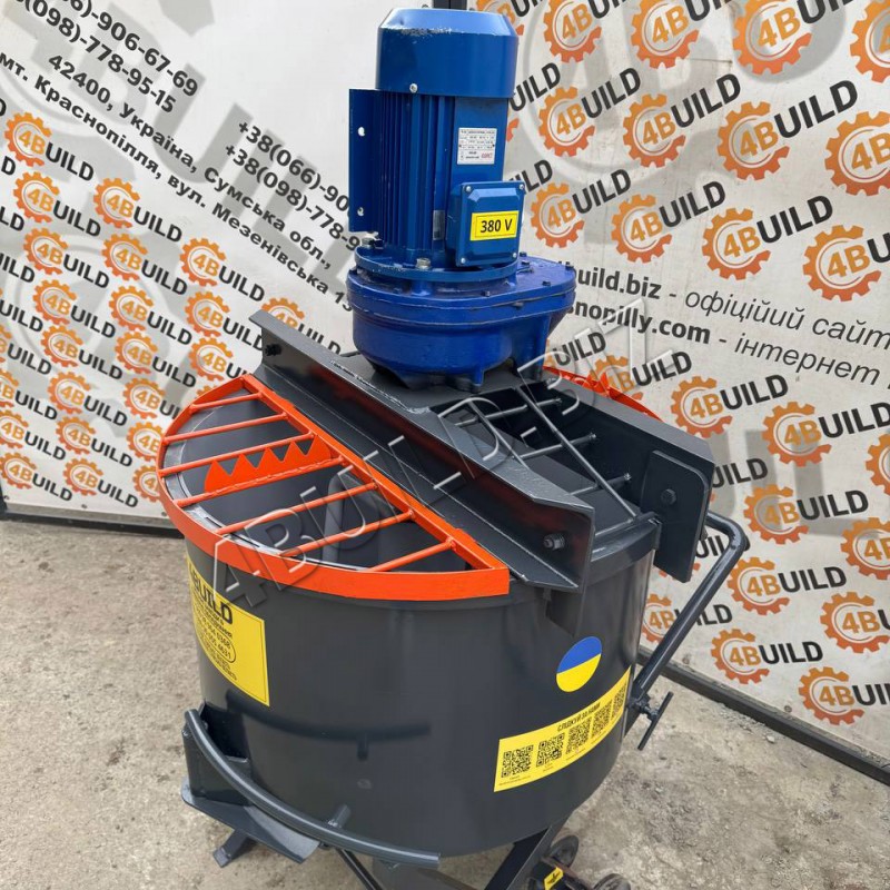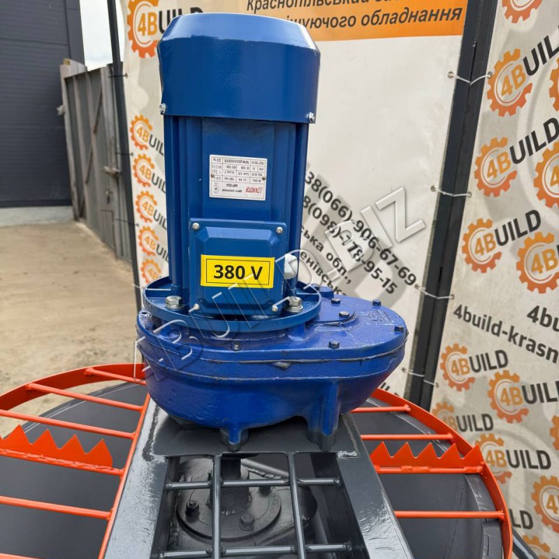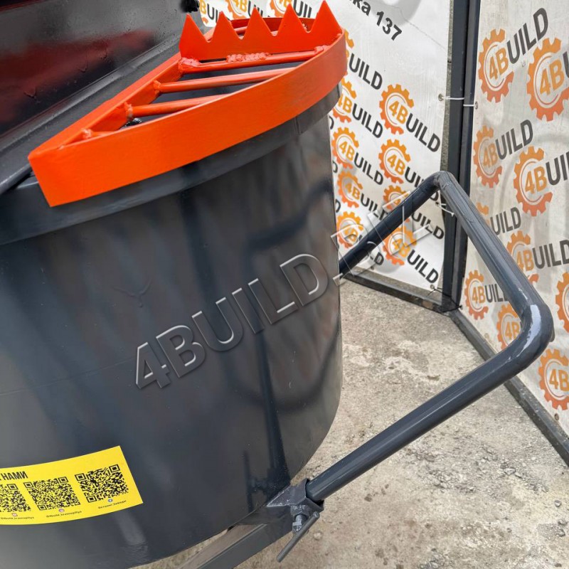Товщина стінок бочки — 6 мм, дна — 6 мм, що гарантує міцність і довговічність навіть при щоденному навантаженні. Оснащений ручним секторним затвором, який забезпечує зручне та контрольоване вивантаження суміші. Для безпеки оператора передбачено захисну решітку, що запобігає випадковому потраплянню сторонніх предметів під час роботи. Вбудований ніж для розриву мішків значно прискорює процес завантаження сухих компонентів.