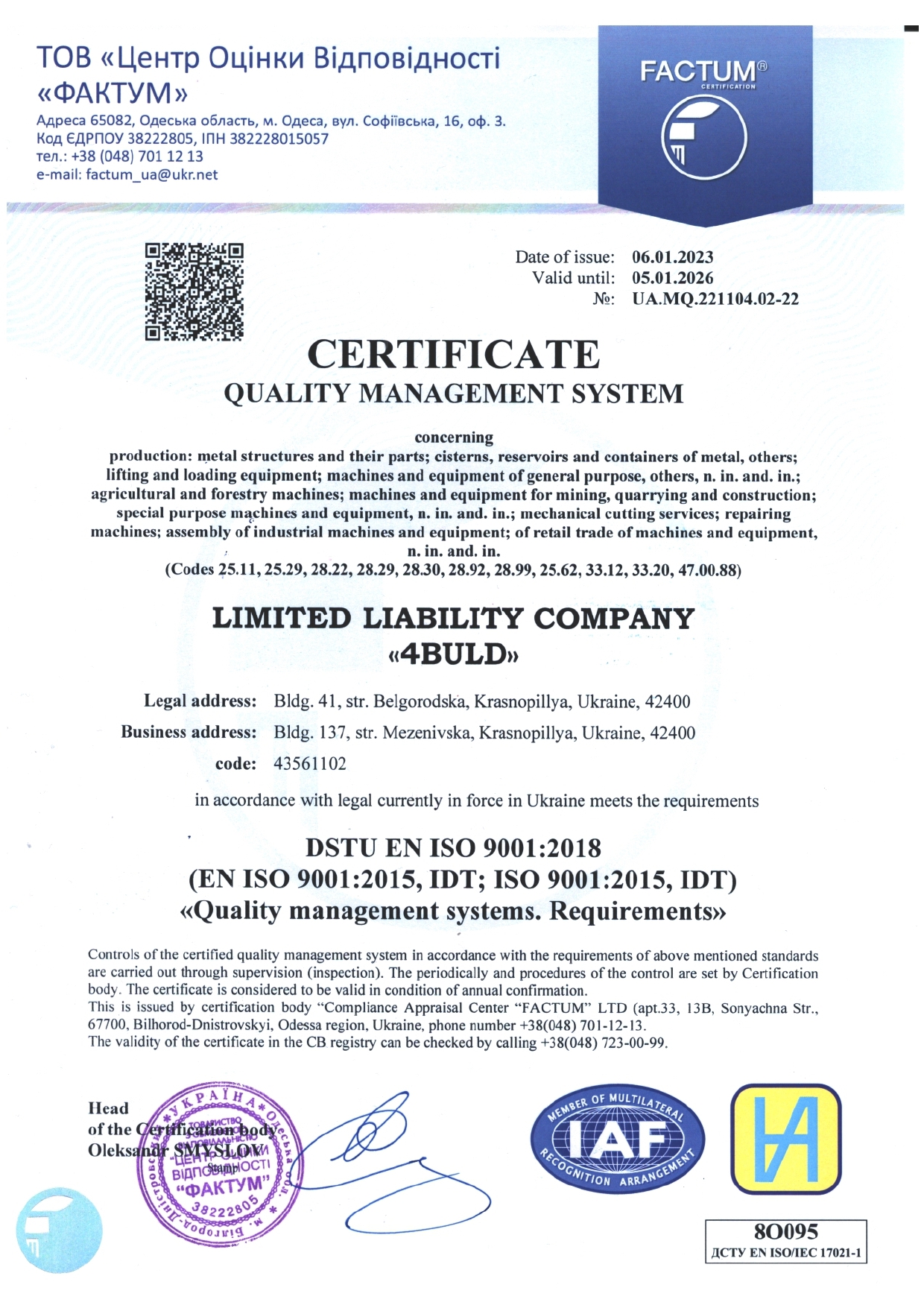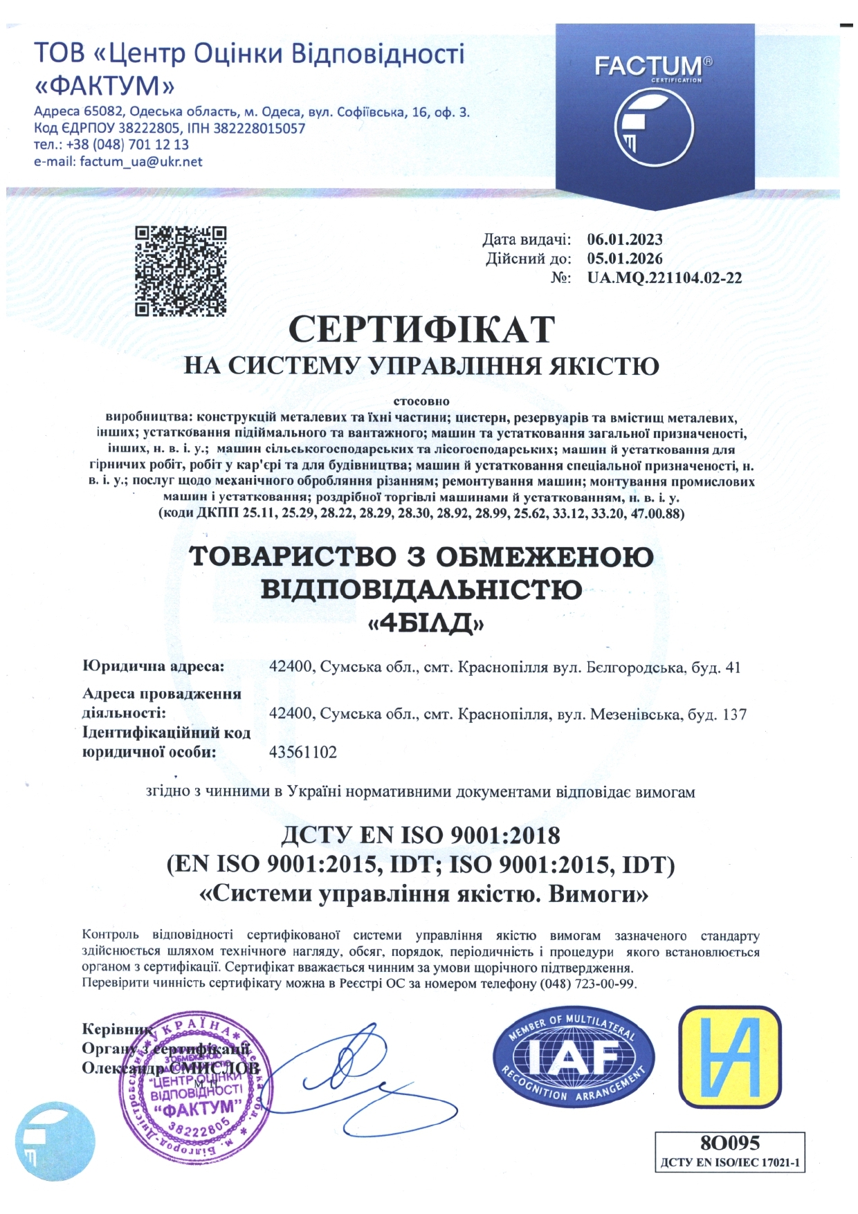 Сертифікат ISO 9001:2018 на продукцію власного виробництва ТОВ 4БІЛД