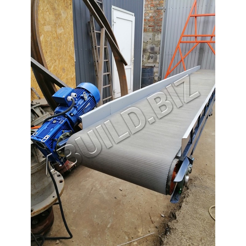 Конвеєр складається із звареної ферми з металу (за бажанням можна з нержавіючої сталі), на кінцях якої розташовані ведучий і ведений барабани. Ведучий барабан встановлюється на верхній частині ферми разом з силовим приводом, що складається з електродвигуна і одноступінчатого черв'ячного редуктора. Ведений барабан монтується на нижній частині ферми, функціонально він є натяжним - забезпечує натяг транспортерної сітчастої стрічки і плавність її робочого ходу.